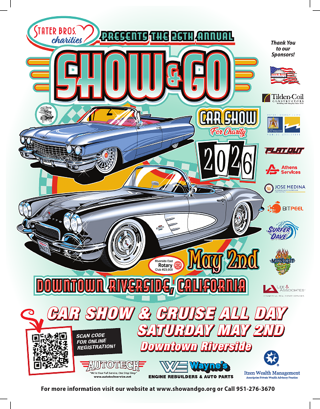 The Riverside East Rotary Club and the Old Farts Racing Team are excited to announce the return of the Show and Go Car Show in 2026. The event will be held on Saturday May 2nd this year in Downtown Riverside. We hope you'll join us for what is sure to be a great weekend.
