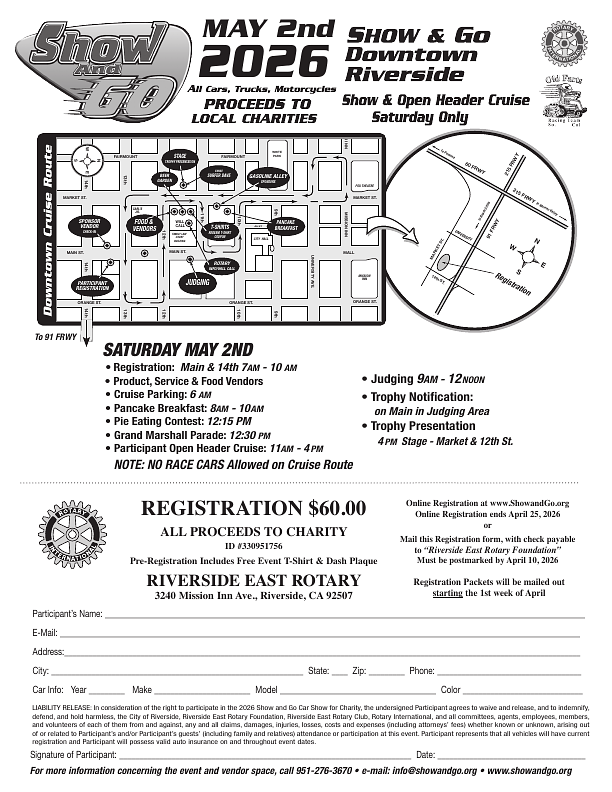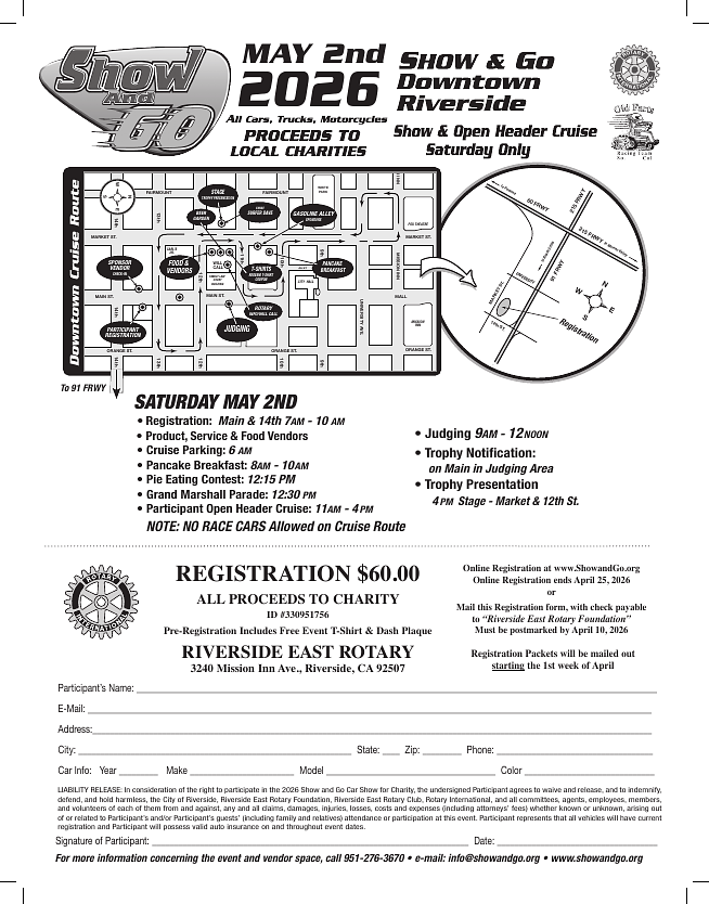 The Riverside East Rotary Club and the Old Farts Racing Team are excited to announce the return of the Show and Go Car Show in 2026. The event will be held on Saturday May 2nd this year in Downtown Riverside. We hope you'll join us for what is sure to be a great weekend.